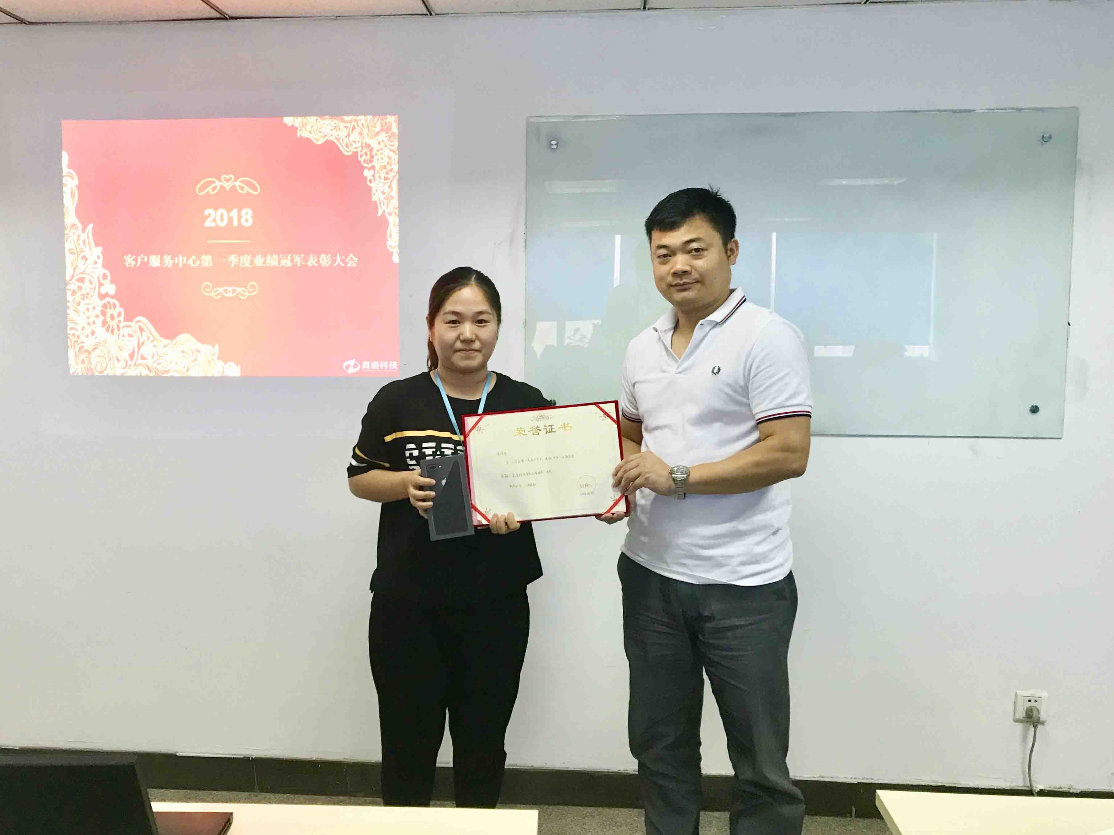 在颁发2018年客户服务中心第一季度业绩冠军奖项时,一个熟悉的面孔走进我们的视野,孟祥宇老师又一次走上领奖台,这一季度的业绩冠军依旧是她!